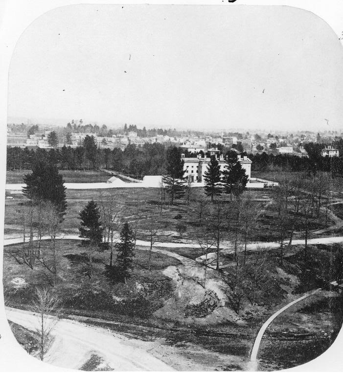 I came across this set of four remarkable photos taken in 1859 by William Notman, from the top of University College. The views they depict correspond to a large section of the 1859 map of the campus.